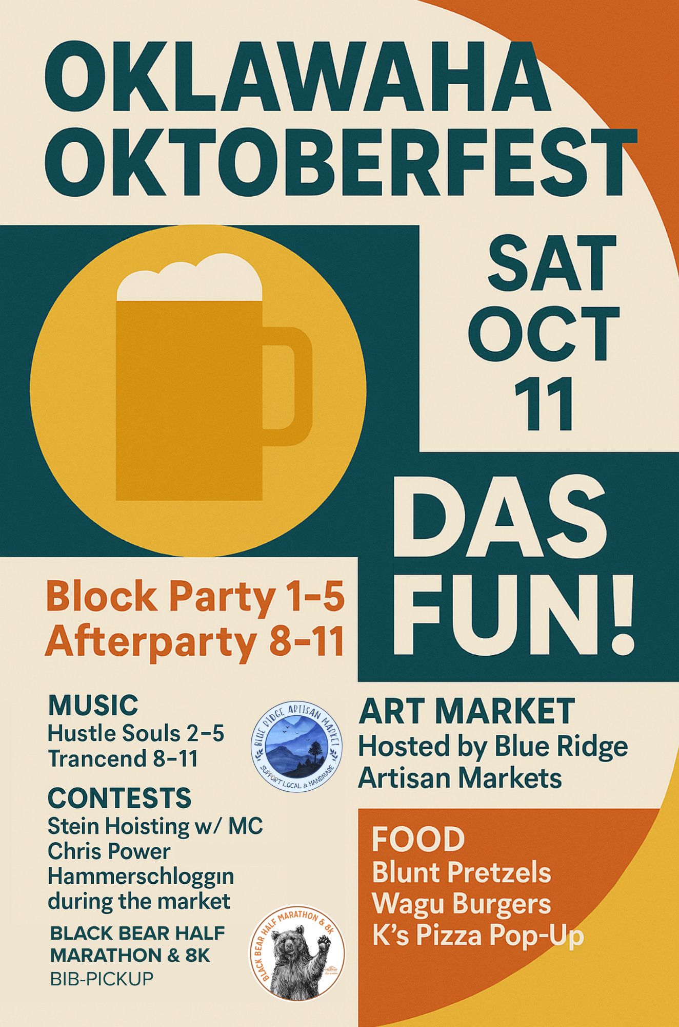 We're excited to partner with Oklawaha Brewing and Blue Ridge Artisan Market to host the pre-event packet pickup during their Oktoberfest celebration! 🍂 Join us for a day packed with family-friendly fun, local and regional artisans, delicious food, games, live music, and of course, plenty of BEER, while picking up your race bib and swag!